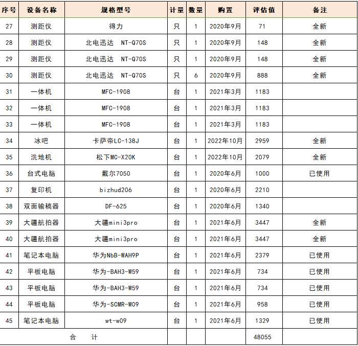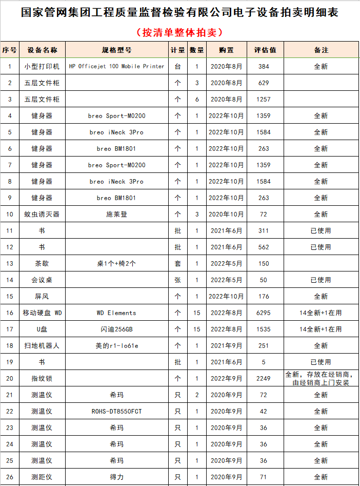 關注微信公眾號我公司受委托,將于近期拍賣:國家管網集團工程質量監(jiān)督檢驗有限公司電子設備及辦公用品一批,多數設備為全新未使用。主要包含:卡薩帝冰吧(全新未使用),大疆航拍器(全新未使用),松下洗地機(未使用),測溫儀測距儀(全新未使用),指紋鎖(全新未安裝),按摩儀(未使用),移動硬盤和U盤(全新未使用),華為筆記本電腦、復印機、打印復印一體機,文件柜、屏風等。