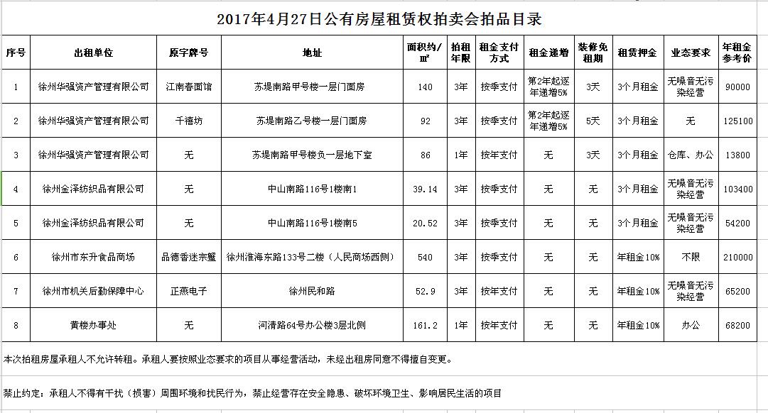 關(guān)注微信公眾號(hào)我公司受委托,定于2017年4月27日10時(shí)開始,通過中國拍賣行業(yè)協(xié)會(huì)網(wǎng)絡(luò)拍賣平臺(tái)(http://pm.caa123.org.cn),以網(wǎng)絡(luò)競(jìng)價(jià)的方式公開拍賣公有房屋租賃權(quán)一批,租賃期限均為3年,以下房屋均為空房:
