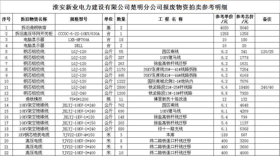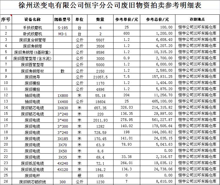 關(guān)注微信公眾號受江蘇徐供、淮供集體資產(chǎn)運營中心委托,我公司將通過中國拍賣行業(yè)協(xié)會網(wǎng)絡拍賣平臺以網(wǎng)絡競價的方式公開拍賣以下單位的廢舊物資各一批: