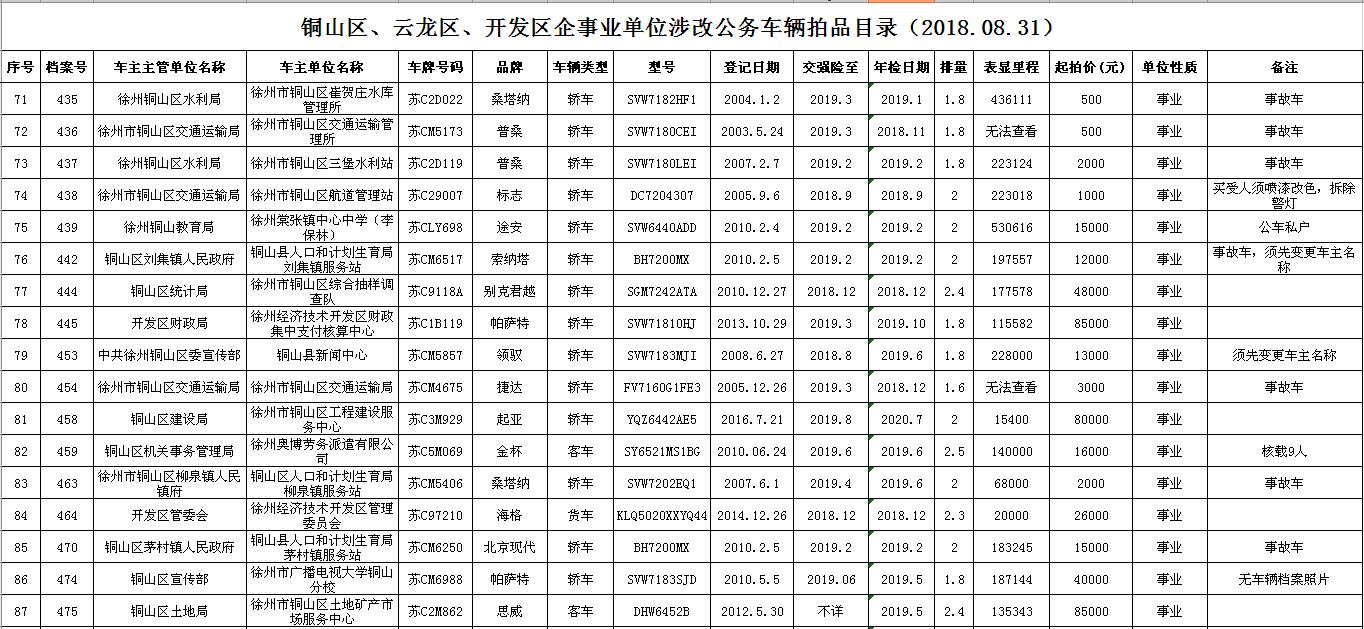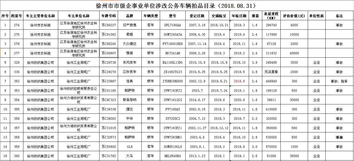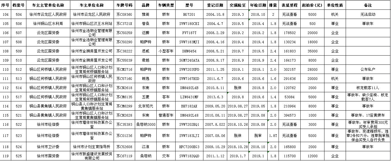 一、拍賣標(biāo)的:徐州市市級及區(qū)級企事業(yè)單位改革公務(wù)車輛共約114輛(詳見拍品目錄)。