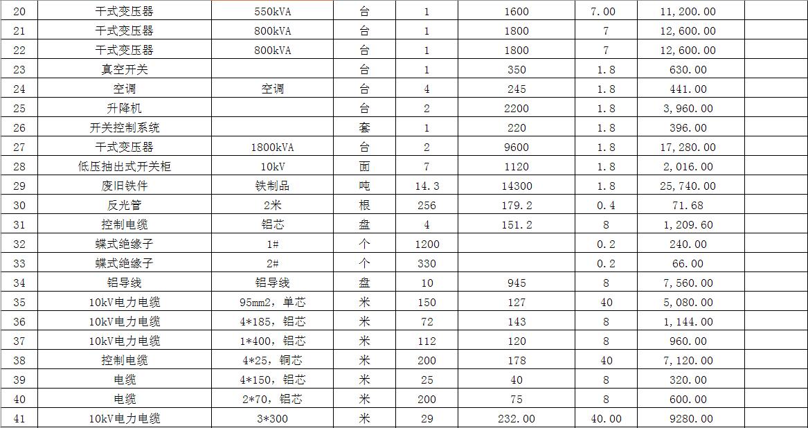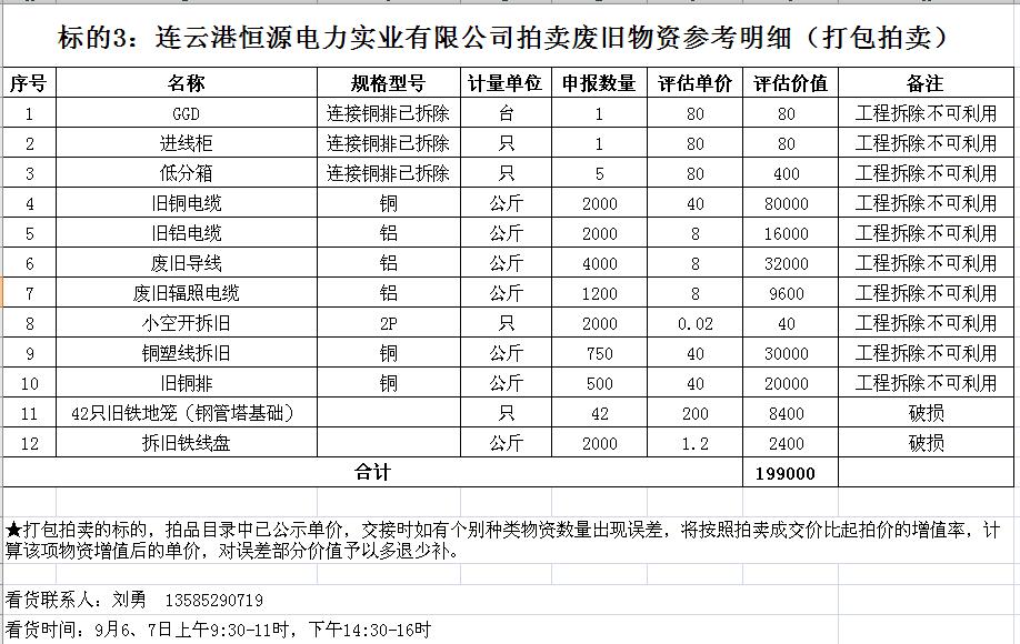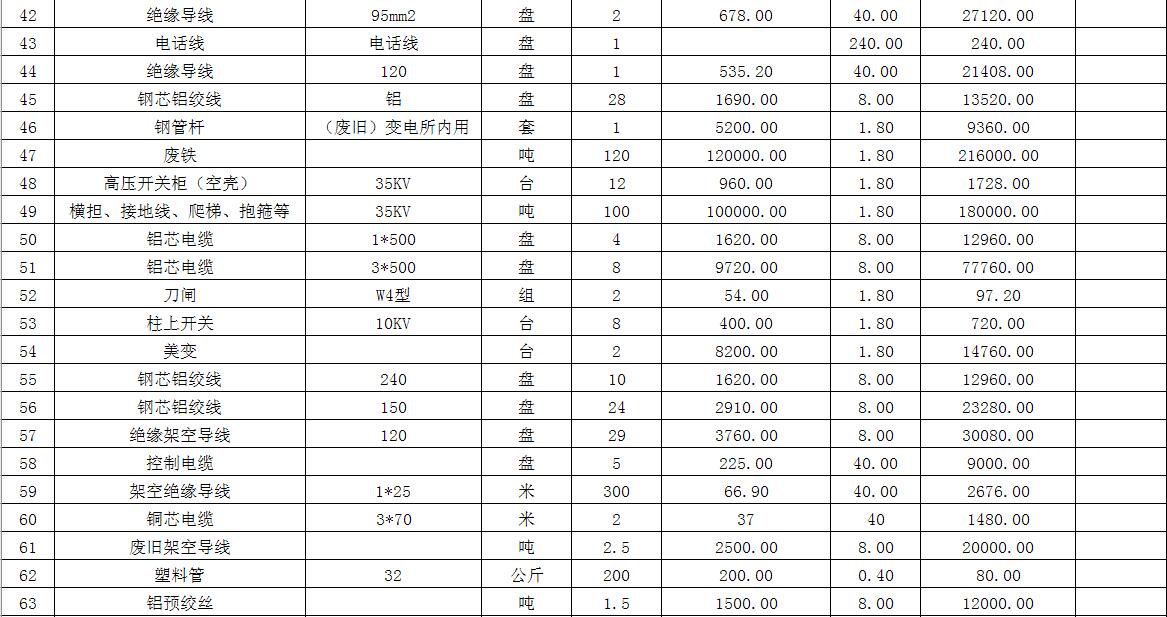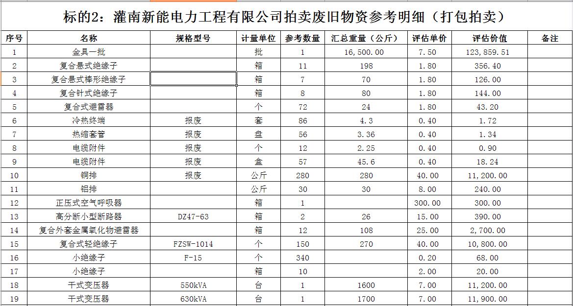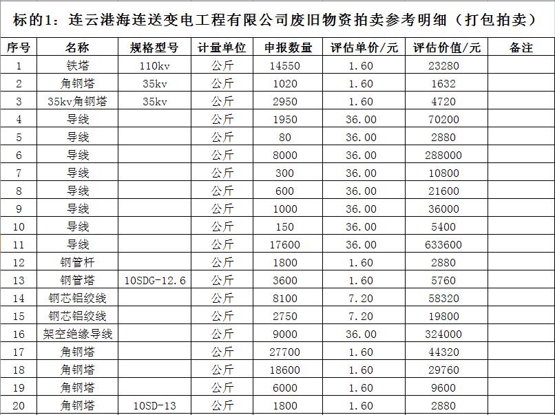 拍賣標(biāo)的主要包括:鐵塔、角鋼塔、鋼管桿、鋼芯鋁絞線、電纜、變壓器、金具等。
