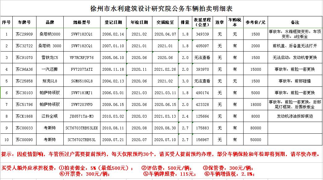關(guān)注微信公眾號受委托,我公司定于2020年4月1日13:00時(shí)在徐州市銀地二手車交易市場四樓東南拍賣大廳通過現(xiàn)場和汽車街網(wǎng)絡(luò)拍賣平臺同步進(jìn)行的方式公開拍賣:徐州市水利建筑設(shè)計(jì)研究院公務(wù)車輛10輛,主要車型有帕薩特、桑塔納、雪鐵龍C5、邁騰、全順、GL8、考斯特等。