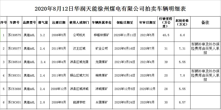 關(guān)注微信公眾號(hào)受委托,我公司定于2020年8月12日14:00時(shí)通過中拍平臺(tái)和現(xiàn)場結(jié)合方式公開拍賣:華潤天能徐州煤電有限公司奧迪公務(wù)車6輛。