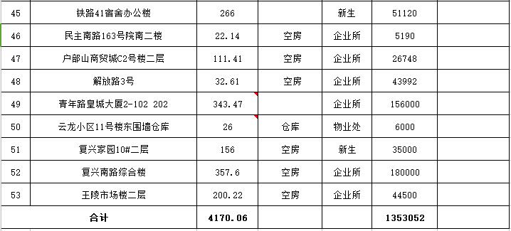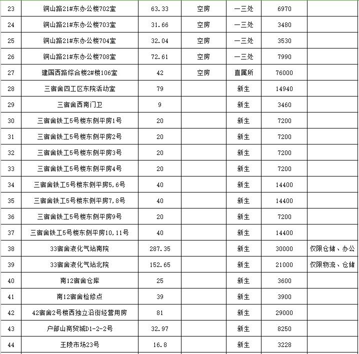 位于銅山路21#辦公房屋15處;位于建國西路2號(hào)樓辦公房屋5處;位于鐵路3宿舍10處、33宿舍2處、南12宿舍2處、41-42宿舍2處,其他分別位于王陵市場、復(fù)興南路、戶部山商貿(mào)城、皇城大廈、解放路3號(hào)、南門橋綜合樓等地。