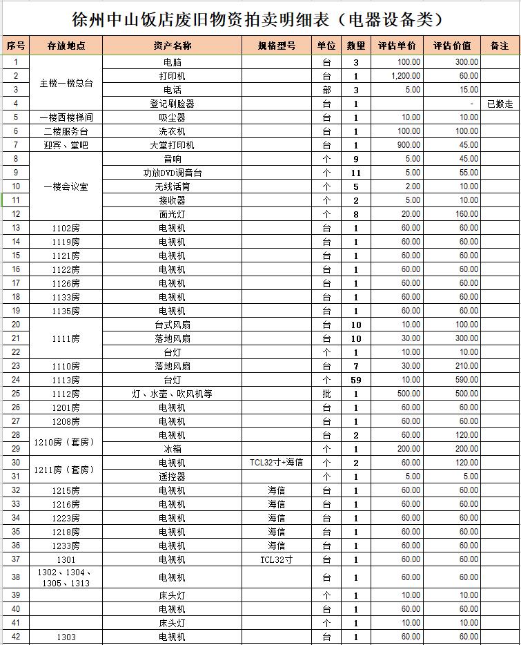 電器設(shè)備主要包含:電視機(jī)、空調(diào)、冰箱、消毒柜、電風(fēng)扇、燈具、電腦、音響設(shè)備、廚房不銹鋼灶具等。