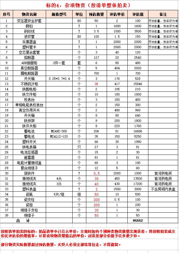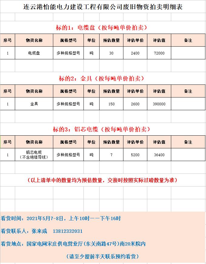 1、連云港怡能電力建設(shè)工程有限公司廢舊物資。主要包含:廢舊鋁芯電纜、金具、電纜盤、雜項物資等。(保證金10萬元)