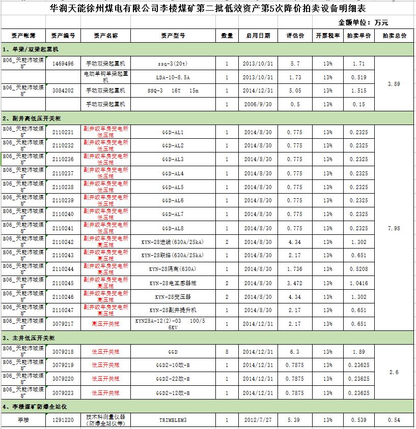2、華潤天能李樓煤礦二手礦用設(shè)備一批。主要包括:主副井提升機、主副井電控裝置、單雙梁起重機、副井高低壓開關(guān)柜、主井低壓開關(guān)柜、防爆全站儀等。(保證金10萬元)