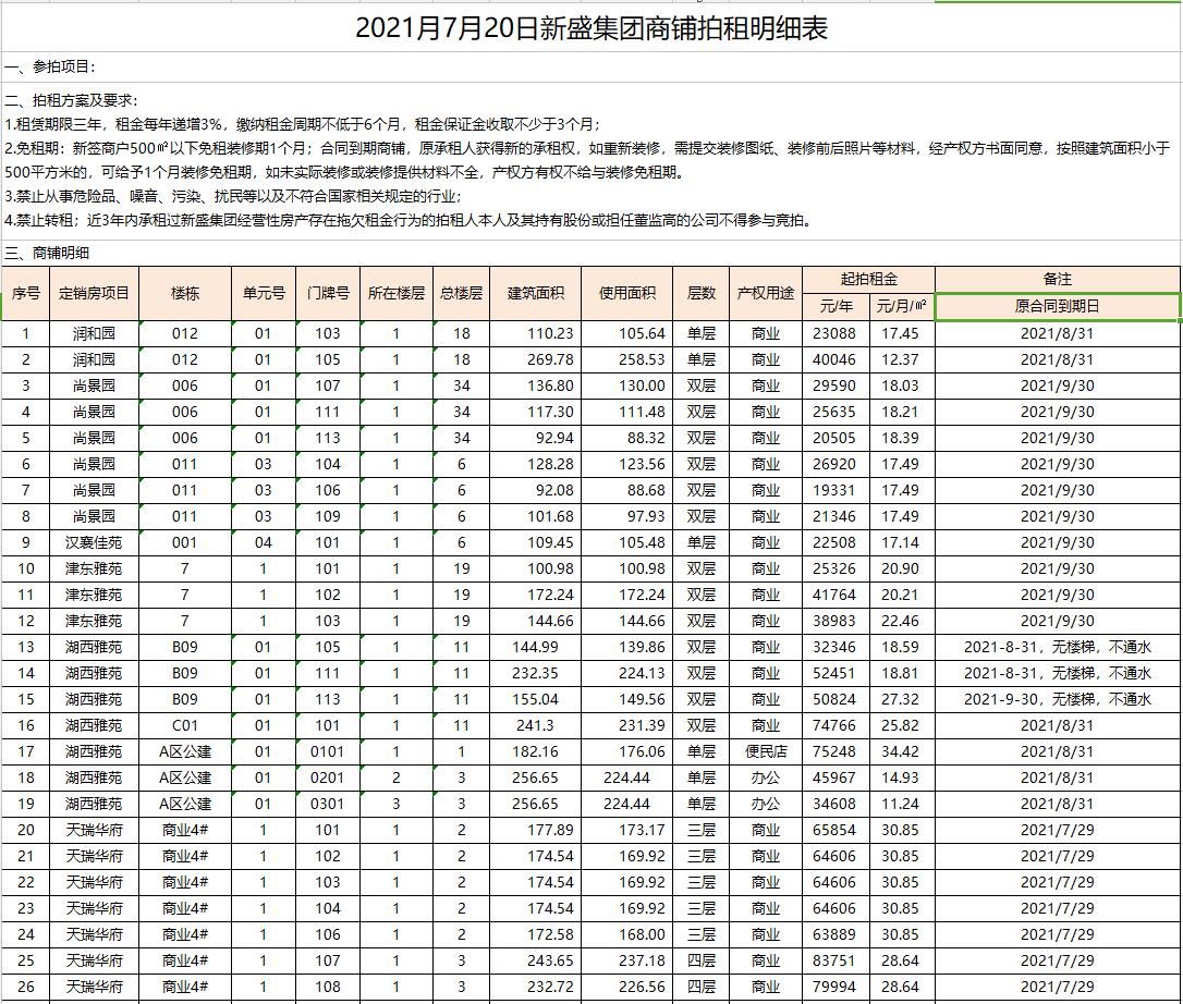關(guān)注微信公眾號(hào)我公司受委托,定于2021年7月20日9:30時(shí)在徐州市中山南路55號(hào)本公司拍賣廳公開(kāi)拍租以下商鋪:潤(rùn)和園3間、尚景園15間、漢襄佳苑1間、津東雅苑3間、湖西雅苑17間、天瑞華府10間、和風(fēng)雅致3間、楓情水岸1間、嘉和雅苑5間、玉潭佳苑3間、康馨園3間。面積分別約為數(shù)十至三百余平米不等,租期均為三年。