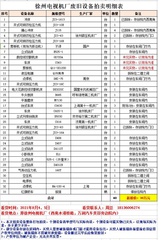 關注微信公眾號我公司受委托,定于2021年8月6日上午10時(延時除外)在中拍平臺公開拍賣:徐州電視機廠廢舊設備一批。主要包含:沖床、壓力機、折邊機、鉆床、機床、車床、刨床、磨床、銑床等、空壓機、電焊機等。