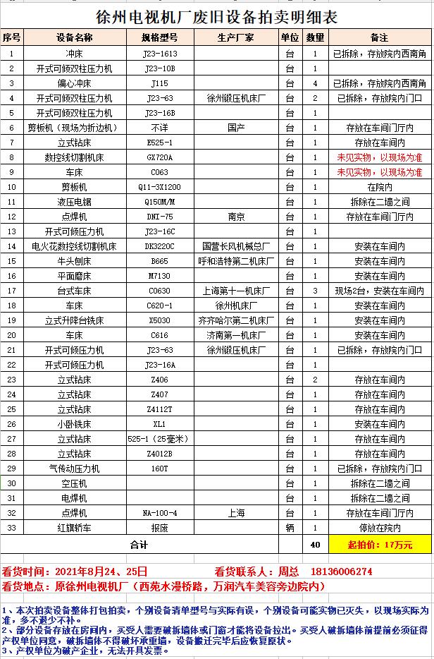 1、徐州電視機(jī)廠廢舊設(shè)備一批。包含:沖床、壓力機(jī)、折邊機(jī)、鉆床、機(jī)床、車床、刨床、磨床、銑床等、空壓機(jī)、電焊機(jī)等。(競(jìng)買人須為具有再生資源回收資質(zhì)的企業(yè)法人),拍賣參考價(jià)17萬(wàn)元。保證金5萬(wàn)元。